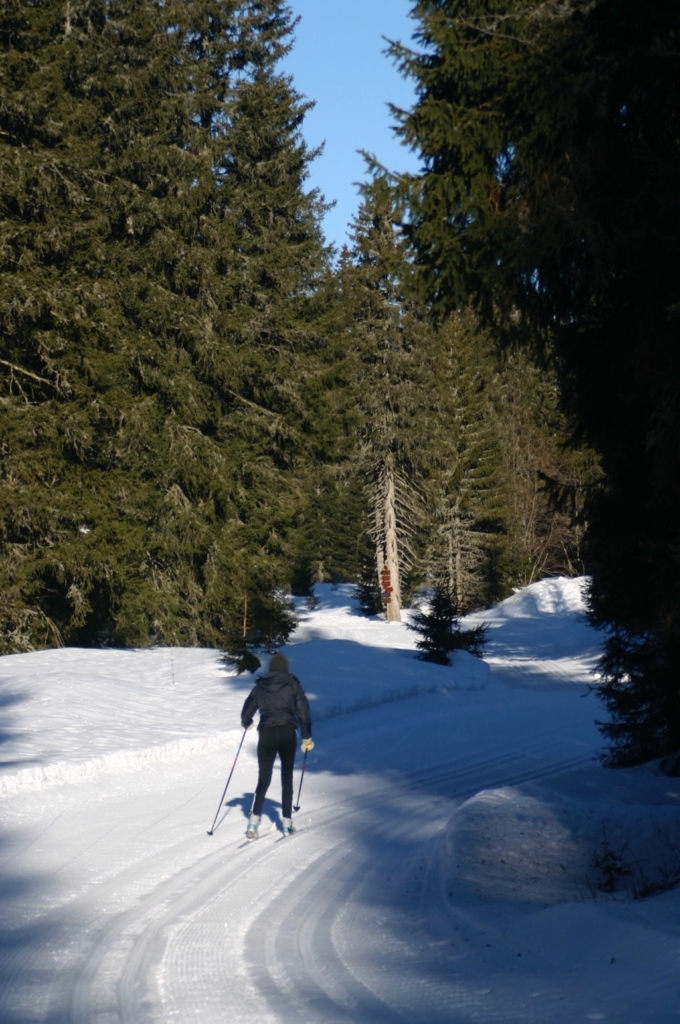 Over 90 miles of trails wind through the pine filled forests and onto the open plateau where cows graze in the summer. Though I have skied the same route many times, I still get stymied because I am unable to navigate the 60 foot drop offs that end in sharp turns.