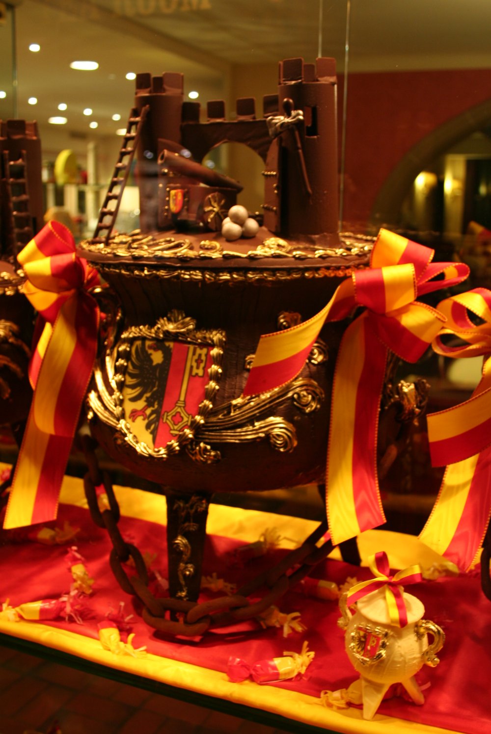 Every mid December, the quiet Calvin city comes alive in a carnival atmosphere like a giant street party. The event entails various activities, street artists and vendors serving mulled wine and soup at outdoor stands. Shop windows, decorated in Geneva’s colors of red and gold, are filled with chocolate cauldrons, symbolizing Madame Royaume’s marmite, filled with candy vegetables made of marizipan.